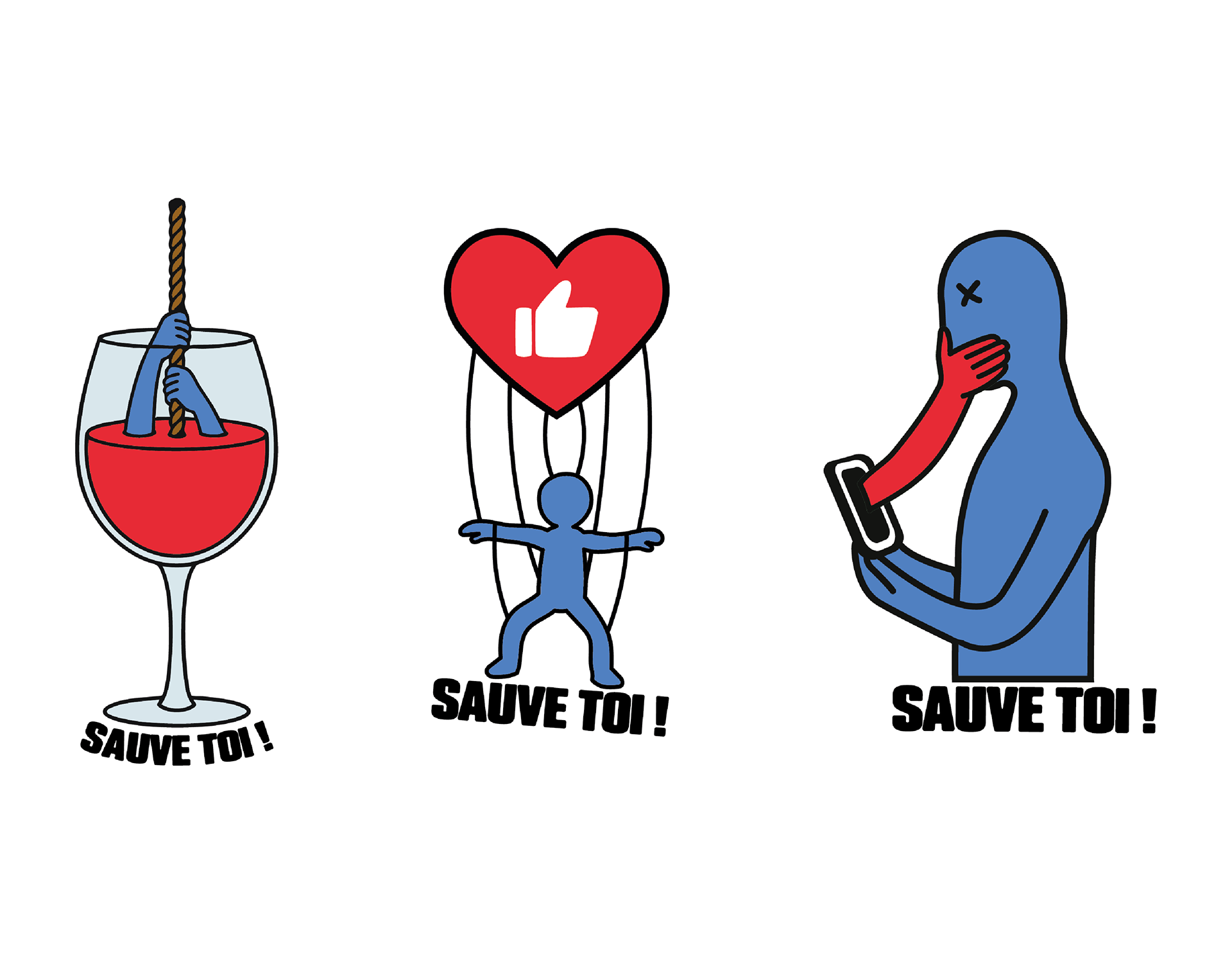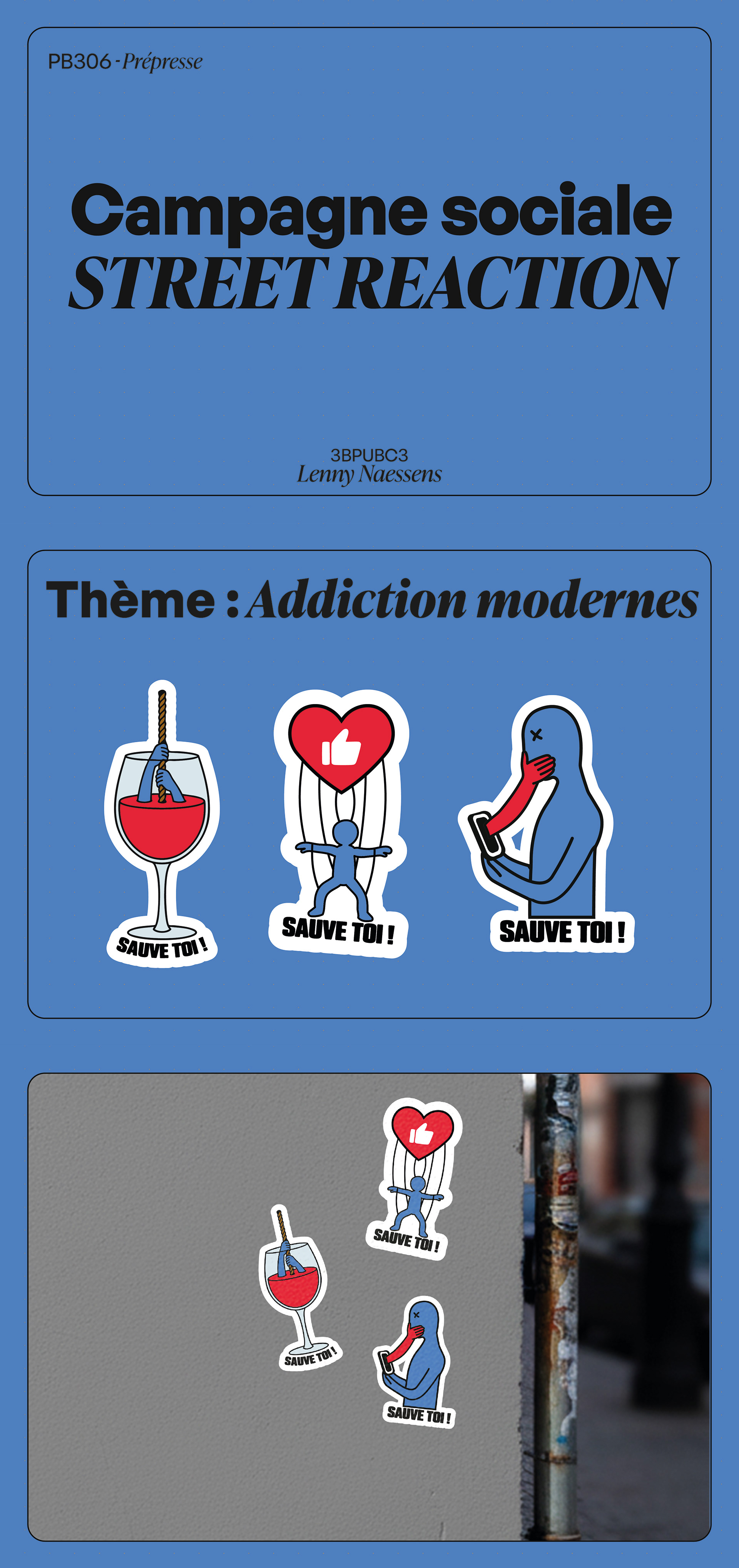 Ce projet consiste en la création d’une série de trois stickers de sensibilisation autour des addictions sociales. L’objectif était de transmettre des messages forts et accessibles, capables d’interpeller rapidement le public dans l’espace urbain comme sur les objets du quotidien. Chaque sticker traite une dimension spécifique de l’addiction sociale à travers une phrase courte et percutante, associée à un visuel simple et symbolique. Le parti pris graphique repose sur des compositions directes et contrastées, conçues pour capter l’attention en quelques secondes et provoquer une prise de conscience immédiate. Une identité visuelle commune — palette restreinte, typographie affirmée et mise en page répétable — assure la cohérence de l’ensemble tout en permettant à chaque sticker d’exister individuellement. Le projet met en avant le design comme outil de communication sociale et de réflexion collective.