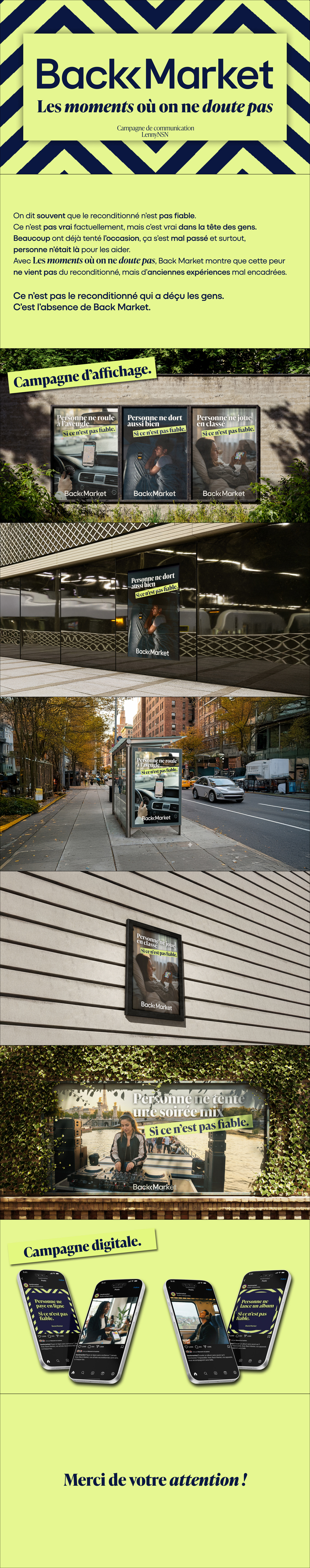 Ce projet de communication repose sur la création d’une campagne globale visant à rendre la consommation reconditionnée plus accessible et immédiatement désirable. L’enjeu était de traduire les principes de la circularité technologique en messages visuels attractifs, capables de détourner l’acheteur du réflexe du neuf sur les plateformes digitales comme dans l’espace public. Chaque visuel aborde une dimension différente de la lutte contre l’obsolescence, en mêlant accroches impertinentes et direction artistique pop, colorée et rassurante. L’humour devient un levier essentiel pour capter l’attention dans un environnement saturé et encourager un changement d’usage. La cohérence graphique s’appuie sur une palette électrique, une typographie distinctive et une mise en page flexible, affirmant l’identité de marque tout en valorisant une technologie durable.